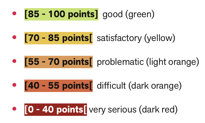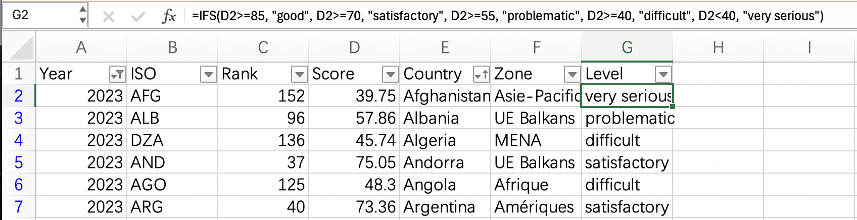 Before making the graphs in Tableau, I needed to process the raw data first. The downloaded data only has the Press Freedom Index (Score) without the levels, so I implemented a excel function to create a new column showing the Press Freedom Level based on the methedology. The standard and color scheme is shown below: