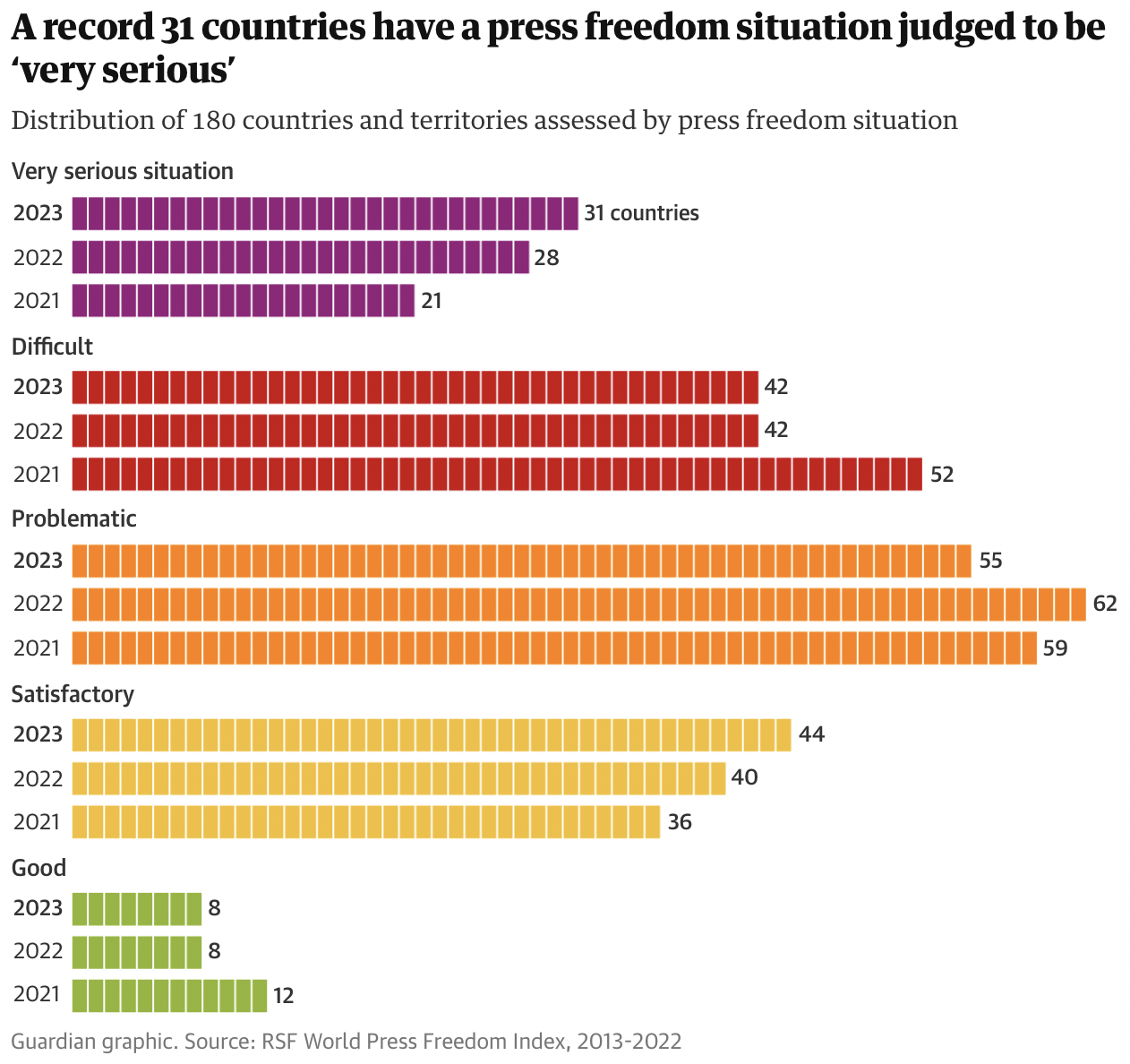 The second chart builds on the narrative of the first by breaking down how countries are distributed across different press freedom levels (“Good,” “Satisfactory,” “Problematic,” “Difficult,” and “Very Serious”). It shows that while the overall average is dropping, the most concerning shift is the increase in countries categorized as “Very Serious” from 2021 to 2023. This aligns with the sharp decline in the average score seen in the first chart, indicating that more countries are facing severe challenges to press freedom.