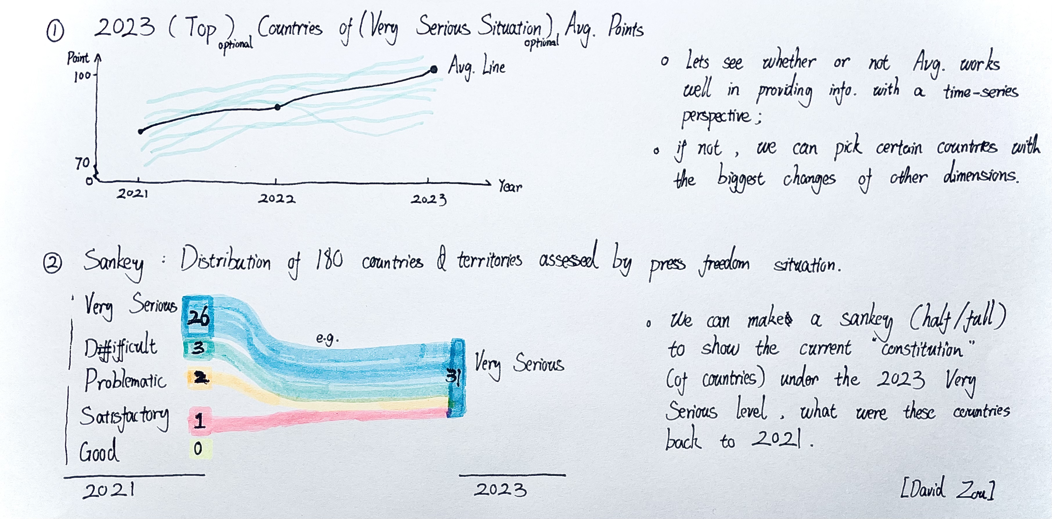 I will make a total of three charts: One shows the Avg. Press Freedom Score of all the countries; one introduce the changes of the number of countries under different levels over time (with “Very Serious” highlighted); the last one is the Sankey, showing where are the countries under “difficult” and “very serious” in 2023 coming from (where were they in 2021).